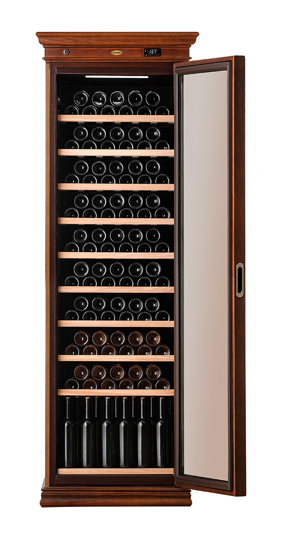 Предназначен для демонстрации и хранения при заданной температуре охлажденных вин. Особенности и дополнительные элементы: полки 9 штук и полка-подставка (дерево), вместимость до 120 бутылок вина, микропроцессорный регулятор температуры со сверхчувствительным датчиком, возможность регулирования температуры на внешней панели управления, световая индикация режима работы, электронный блок управления, дверь-стеклопакет с тонированным покрытием против проникновения УФ-лучей с замком, автоматическое поддержание температуры в камере.